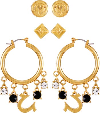 Three styles, endless attitude. This trio set includes edgy charm hoops, classic gold studs, and bold True Religion logo discs. Mix and match for a customized look that reflects your mood and your mission.