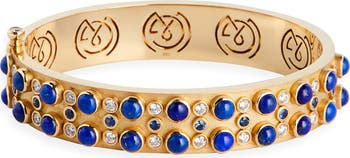 Vivid lapis cabochons and luminous white diamonds bring radiant dimension to this regal bangle bracelet handcrafted in 18-karat gold.