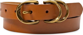 A trio of gleaming buckles brings bold hardware shine to this versatile leather belt detailed with an engraved logo for an understated signature.