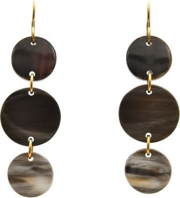 Hand carved and polished cow horn earrings in a simple triple circle geometric design. Sustainably sourced horn from rural Ugandan cattle keepers, horn is used and upcycled instead of wasted Hand carved in small scale, Fair Trade artisan cooperative in Uganda High variability of horn color ensures that no two pieces are the same Jewelry pieces come in variable shades of white 14K gold plated findings and stainless steel posts crafted by Fair Trade verified program to provide employment and training to formerly trafficked women Skillfully assembled in Uganda with love and care HANDMADE IN UGANDA APPROXIMATE SIZE: 2. 5" x 1"