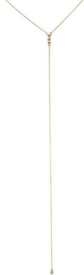 14K gold lariat necklace with three diamond bezel accents. Measures 14" with two 1" extenders.
