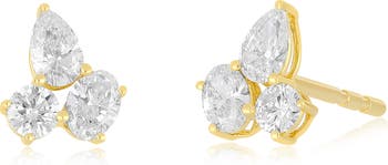 A trio of mixed diamonds nestles at the centers of these stunning stud earrings that bring brilliant sparkle to your lobes.