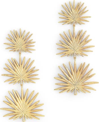 A trio of fan palms sparkle and shine as they sway beguilingly on these drop earrings made from 18-karat-gold-plated brass and hand-set with crystals.