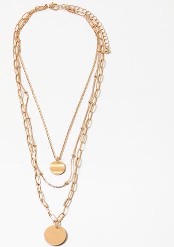 This eye-catching multi-layer necklace features vibrant gold necklaces with delicate beads and disc pendants paired with gold chains that add various lengths. Its classic design adds a timeless touch to any blouse, tee, or dress that you're sure to reach for every time.