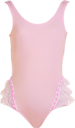 This striking one-piece features a serene pastel pink base, uniquely defined by triple-tiered white lace ruffles at the hips.