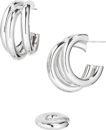 This dazzling set of triple-loop hoop earrings and a minimalist ear cuff offers a captivating look meant to be worn both day and night.