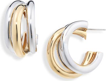 These two-tone triple-loop hoop earrings offer a captivating look and unlimited pairing with ensembles and other accessories.