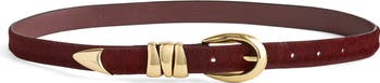 Crafted from genjuine haircalf in a fit that's designed to be worn at the hips, this belt features a chunky metal buckle and triple keeper for a superdressy feel.