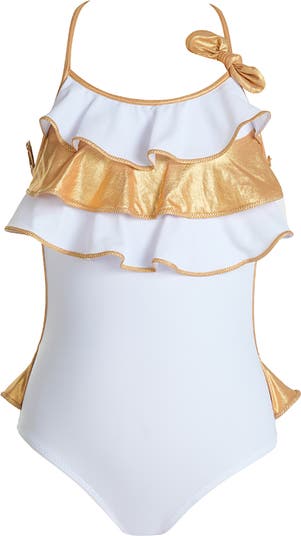 This striking white maillot features a sophisticated neckline adorned with three tiers of voluminous ruffles: two in classic white with gold contrast piping, and a center tier in brilliant metallic gold. Detailed with a charming gold bow on the shoulder and matching ruffles at the leg openings, this piece offers a high-fashion, boutique-ready finish.