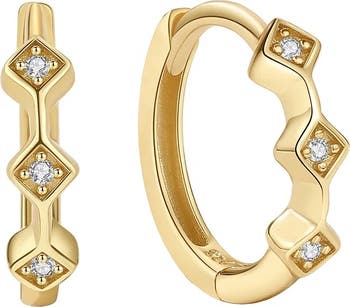 - The earrings feature three diamond-shaped cubic zirconia stones, each strategically placed for maximum brilliance. The sharp, geometric shape of the stones adds an edgy, contemporary touch, catching the light from every angle. The huggie design is compact and snug, sitting closely to the earlobe for a sleek, polished look. These earrings offer a chic, minimalist vibe, perfect for daily wear while still providing a bit of statement.