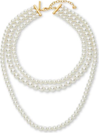Glow with elegance when you wear this beautiful necklace hand-strung with three strands of luminous faux pearls and marked by a signature logo charm.