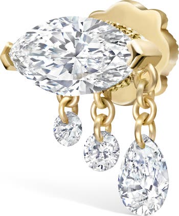A trio of graduated diamonds trickles from an equally bright marquise anchor in this milgrain-framed stud earring.