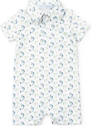 Short sleeve polo-style shortall with button front and three snap closure in stride. Made from 100% Peruvian Cotton. This item is not intended for sleepwear.