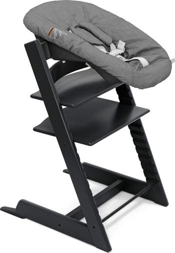 This durable and ergonomically friendly wooden chair designed for maximum adjustability is complete with Stokke's newborn insert. The newborn insert is designed with a five-point safety harness and soft shoulder pads for support and comfort. It cradles your little one, lifting them to table height, and it provides a cozy, nest-like environment they are sure to enjoy. A toy hanger is included so that baby can have even more fun at the dinner table. Red-green indicators turn green when Newborn Set is mounted correctly on the Tripp Trapp Highchair². It includes an extended seating rail, as well as side and back support to develop the skill of sitting. The versatile design brings your little one to the dinner table, and therefore closer to the family. The new and improved harness boasts an effortless two-click buckle, as well as a quick-release unbuckle feature.
