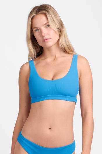 The JOLYN Trish Bikini Top features a scooped front neck, front side cutouts, and a cross-back detail for a stylish, secure fit. Perfect for swimming, surfing, and active water sports, it offers both flexibility and support.