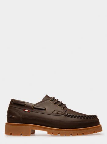 Inspired by boat shoes, the Tristan moccasin is a city-ready silhouette crafted from brown calf leather with whipstitched details and a distinctive treadsole.