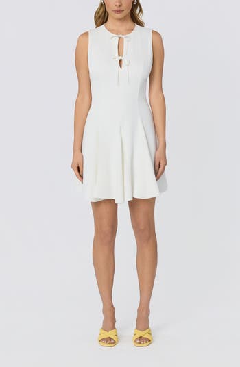 Dainty ties tether the front of this sleeveless stretch-kissed dress accented with an airy neckline cutout and finished with a flowy flared skirt.