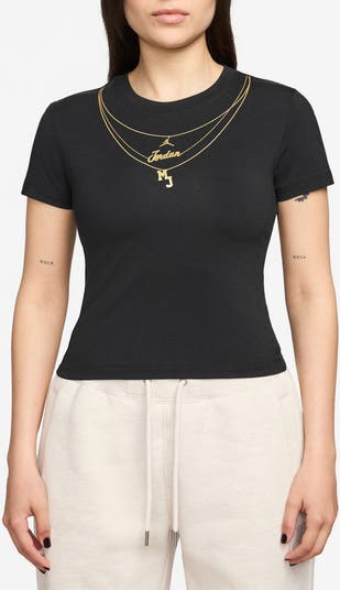 Sport your best style game on or off the court in this shrunken cotton T-shirt pre-accessorized with a trio of embroidered 'necklaces' honoring the GOAT behind the brand.