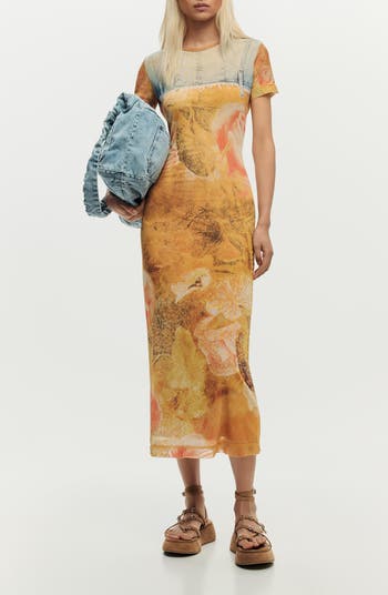 Realistically rendered jeans yokes appear to be pinned onto this midi's yoke, creating a DIY-hybrid look for this slim-fitting T-shirt dress.