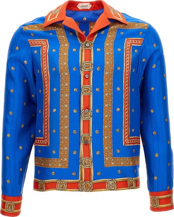 Versace’s house icons take a painterly turn on this runway-featured top rendered on smooth Italian-silk twill with a cool, flowing handfeel. The trompe l’oeil print builds a layered illusion of chains and Medusa ornaments that reads rich, graphic and unapologetic.