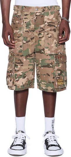 Cut from rugged rip-stop cotton in a vintage camouflage print, these relaxed-fit cargo shorts bring a stylish edge to utility dressing. Generous cargo pockets meet signature brand accents for a built-to-stand-out look.