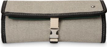 This small round pouch case that's designed to hold a week's worth of jewelry with an assortment of pockets, ring bags and an earring panel.