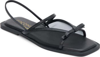 Slim faux-leather straps and a delicate bow stand out against mesh inlays on a square-toe sandal fitted with an elasticized slingback strap for secure wear.