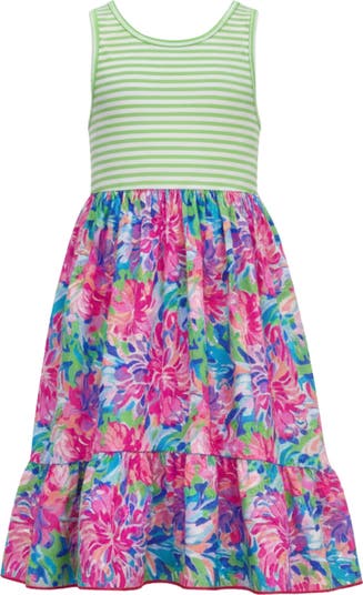 Full of color, charm, and breezy movement, this floral hi-lo dress brings effortless resort style to her warm-weather wardrobe. The playful mix of green stripes and watercolor florals creates a cheerful, sunshine-ready look she’ll love twirling in all season long.