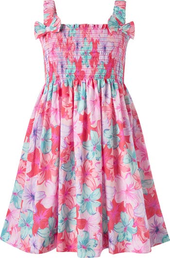 - The lively floral print in shades of pink, coral, and aqua evokes tropical gardens and seaside holidays, making it a standout choice for resort vacations, destination celebrations, and family photo occasions. Thoughtfully designed in London, this sundress balances playful color with timeless craftsmanship—easy enough for daytime exploring yet polished enough for evening dinners. Machine wash with similar colors. Medium steam iron.