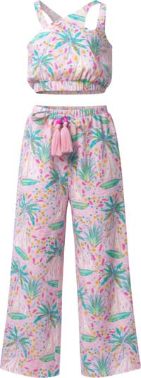 Bold, breezy, and bursting with tropical charm, this two-piece palazzo pant set is made for sunshine-filled adventures. Featuring a stylish one-shoulder top and flowy wide-leg pants, the vibrant palm print and playful tassel details create a resort-ready look she’ll love wearing from beach days to vacation dinners.