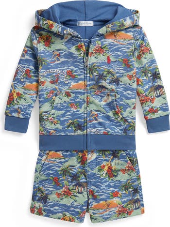 Baby will be vacation-ready in this comfy French-terry set featuring a hoodie and shorts in a tropical print of surfers, palm trees and colorful flowers.