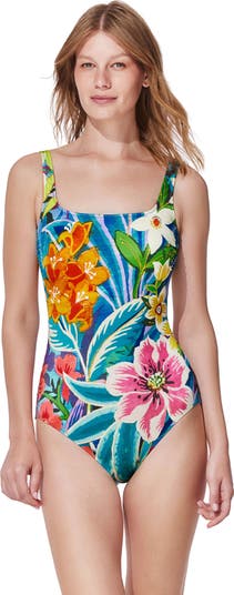 Get a taste of the tropics in the Tropicana Square Neck One Piece. Featuring built-in soft cups, tummy control, front and back lining, adjustable straps, and full back coverage for a sculpted look that���ll bring a tropical vibe wherever you go.