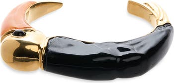 This gleaming, golden cuff bracelet in the shape of a toucan was featured on the spring '26 runway. It's crafted in Italy with resin accents for a bold and tropical-inspired statement piece.