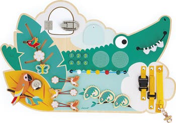 This jungle-inspired busy board comes brimming with more than 14 hands-on activities to twist, slide, snap and discover. Little explorers can guide beads through a maze, spin chameleon gears, turn a clicking eye, ring a bell and peek into a hidden mirror, while practicing real-world skills with buckles, snaps, elastic bands and a working metal lock. Crafted from smooth wood with tactile silicone and felt accents, it’s designed for hours of screen-free play that builds fine-motor coordination and cause-and-effect curiosity.
