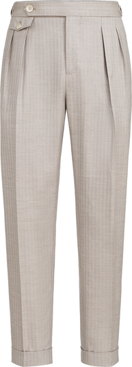 - Zip closure with button, metal hook and backing buttonSlanted front pockets with watch pocketDouble pleatBuckles on the sideBack welt pockets with buttonCupro lining to kneeCuffed hem
