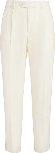 - Zip closure with button, metal hook and backing buttonSlanted front pocketsPleatBack welt pocketsCupro lining to kneeCuffed hem