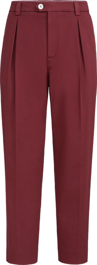 - Zip closure with button, metal hook and backing buttonSlanted front pocketsPleatTee holder on legBack welt pocketsPlain hem