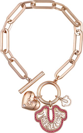 Chic and charming, this True Religion link bracelet features oversized chain links and signature pendants - including a sparkly horsehoe logo and heart charm. With its toggle clasp and polished finish, it's the perfect blend of edgy elegance and iconic style.