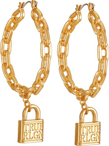 Locked in luxury. These True Religion bold gold-tone frozen chain hoops are finished with signature lock charm for a statement look that’s fierce, fearless, and fashion-forward.