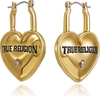 Lock in your look with these gold-tone heart-shaped hoops engraved with the True Religion logo. A statement piece with attitude and charm.
