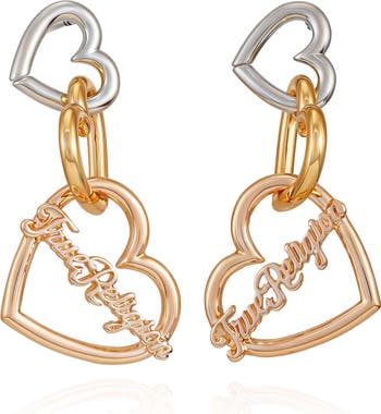 Triple the hearts, triple the attitude. These True Religion linear earrings feature intertwined open-heart designs finished in a luxe tri-tone plate, topped off with the signature script logo. They’re a bold nod to love, loyalty, and iconic street style.