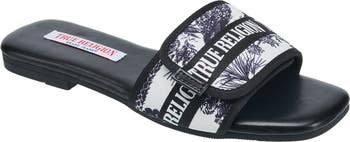 The True Religion Missy Sandal with a logo strap offers comfort and casual style. Featuring a sleek design with a bold True Religion logo on the adjustable strap, these sandals provide a customized fit for easy wear. The simple yet stylish design makes them a versatile addition to any casual wardrobe, while the strap ensures a secure and comfortable fit for all-day wear. Lightweight and practical, these sandals are ideal for everyday outings or relaxing in style.
