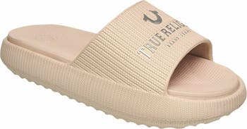 The True Religion Women's Meg Pool Side Slides are the epitome of summer chic, blending comfort with stylish flair, perfect for lounging by the pool or casual outings. These slides feature a broad, cushioned strap adorned with the True Religion logo, adding a touch of designer sophistication to the overall look. The strap is crafted from high-quality, water-resistant materials, ensuring durability and ease of maintenance, making them ideal for wet environments.