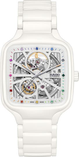 Designed with a cutout skeleton dial and exhibition caseback to expose the inner jewels and automatic mechanism, this Swiss-made watch means to stand out. This is the brand's first watch style made using a square high-tech ceramic case that is scratch-resistant and comfortable to wear.