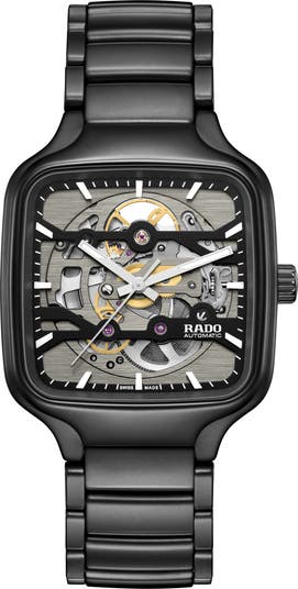 This version of an iconic RADO watch is the brand's first crafted with a square monobloc high-tech ceramic case that's lightweight and scratch-resistant. The transparent dial and case back reveal the watch's impeccable Swiss movement and showcase a striking, distinctive design.