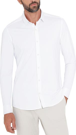 Long-sleeve tech shirt in a nylon-spandex blend. Features antibacterial finish, classic collar, and button closure.