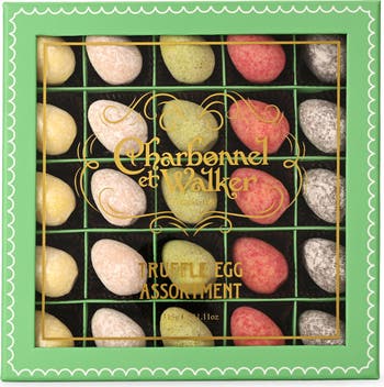 Pretty pastels color a giftable selection of egg-shaped truffles that include raspberry, passionfruit, milk chocolate sea salt, strawberry and lemon flavors.