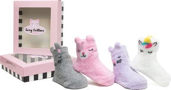 An assorted set of four pairs of fun socks styled to look like cozy critters are knit from a plush blend with a stay-put fit and nonskid bottoms.