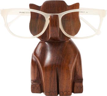This wooden glasses holder is handcrafted with sheesham, ethically sourced Indian rosewood featuring a trunk up elephant. This wood eyeglass holder is handcrafted by artisans in north central India. The process begins with solid blocks of wood. Artisans use traditional wood craft techniques and hand tools to skillfully carve the blocks into functional works of art. Many of the patterns are deeply influenced by age old cultural motifs. The pieces are finished with wax for a smooth, polished result. The artisan's precision and mastery of this craft, which has been passed down for generations, is demonstrated in this piece. As far as elephant symbolism goes, if the trunk is up, it is good luck! An upward pointed elephant trunk is believed to bring energy, luck, prosperity, and kindness. Eyeglasses holder stands are one of our top selling gift items. They make a quirky, fun yet versatile, and functional gender neutral gift for people of various ages. To secure a pair of glasses on the holder, rest the bridge of the eyeglasses on the elephant's nose, and the legs of the eyeglasses behind its head. This piece doubles as a wooden sunglass holder. When not in use, the eyeglass holder is an attractive hand carved elephant from India displayed on a bookshelf, desk, coffee table, countertop, or nightstand. Our trunk up elephant could be a great good luck gift for students, good luck gift for a new home, gift for good luck for a new job, or a gift for prosperity.