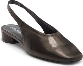 A squared-off toe and low block heel balance a rich leather slingback that complements your work-to-weekend looks.